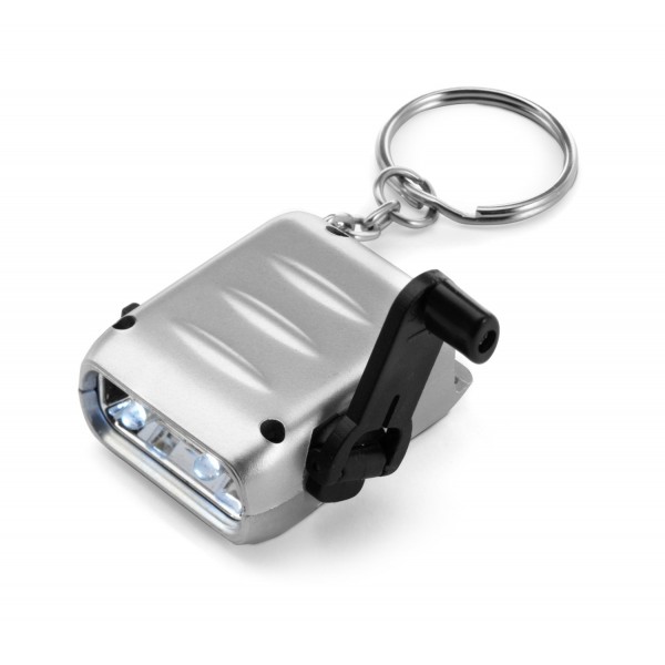 Breloc mini dinam cu 2 leduri si inel de chei, material plastic, culoare argintiu, dimensiuni 4x3x1,5cm, greutate 21g.