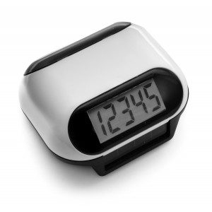 Pedometru cu alimentare cu energie solara, material plastic, dimensiuni 5x4x2,5cm, greutate 20g, culoare alb cu negru.