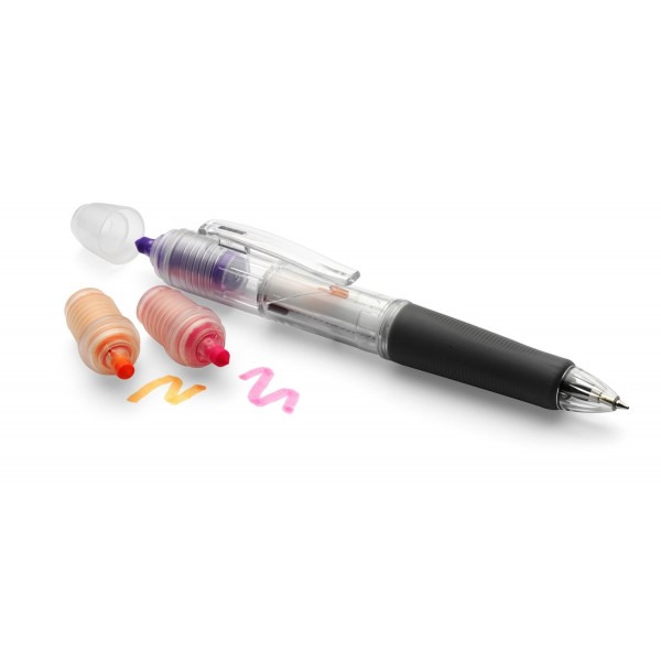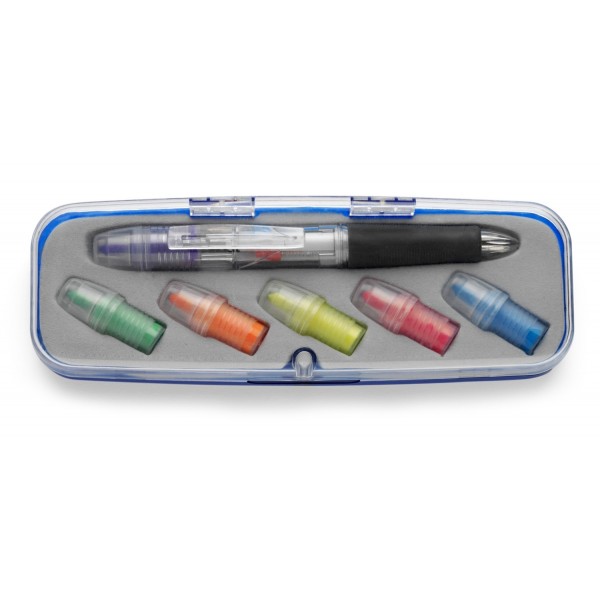 Pix din material plastic si cauciuc are 3 mine (rosu, albastru, negru) si 6 text markere, dimensiuni 18x6,3x2,8 cm, greutate 10g.
