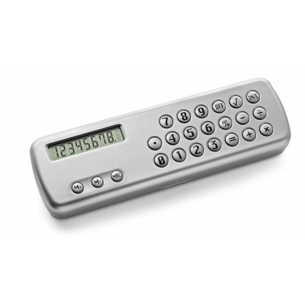 Cutie pixuri cu calculator 8 cifre din material plastic, dimensiuni 19,5x6,2x2,4 cm, greutate 20g.